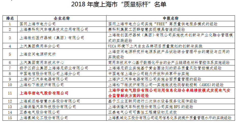2018年度上海市“質(zhì)量標(biāo)桿”名單