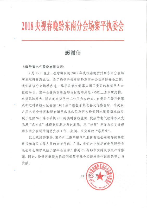 2月24日,2018央視春晚黔東南分會(huì)場(chǎng)黎平執(zhí)委會(huì)向上海華宿電氣股份有限公司發(fā)來(lái)感謝信,對(duì)【電丁丁】智慧防火大數(shù)據(jù)平臺(tái)實(shí)時(shí)在線監(jiān)測(cè)并消除電氣火災(zāi)隱患,從“技防”方面力挺央視黔東南分會(huì)場(chǎng)的消防安全工作,確保央視春晚分會(huì)場(chǎng)成功舉辦表示感謝。