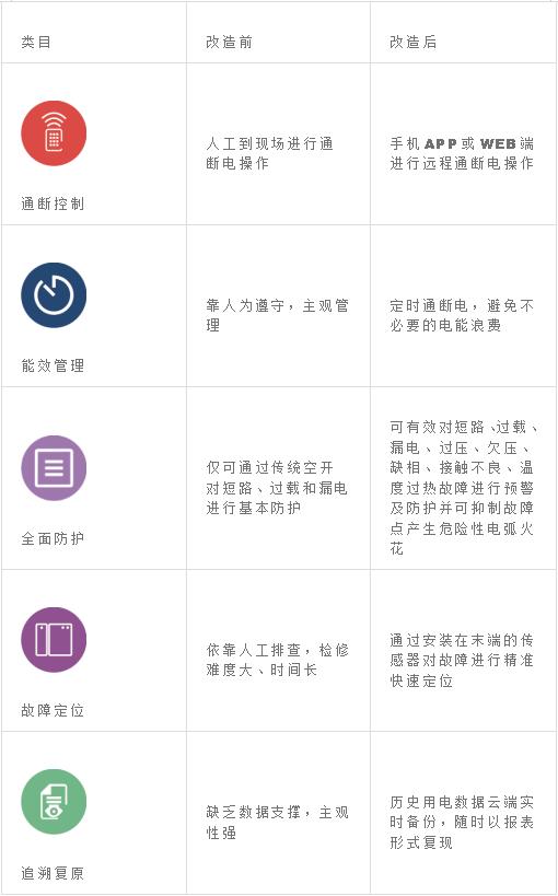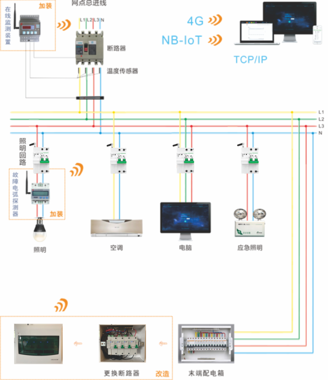 改造步驟:1、在配電總箱的進(jìn)線處加裝在線監(jiān)測(cè)裝置;2、在照明回路上加裝故障電弧探測(cè)器;3、重要場(chǎng)所如資料檔案室的配電回路上加裝滅弧式短路保護(hù)器;4、輕改末端配電箱并將普通斷路器更換為智能斷路器;