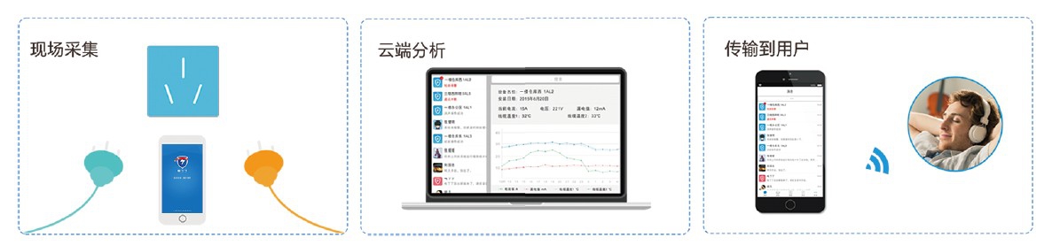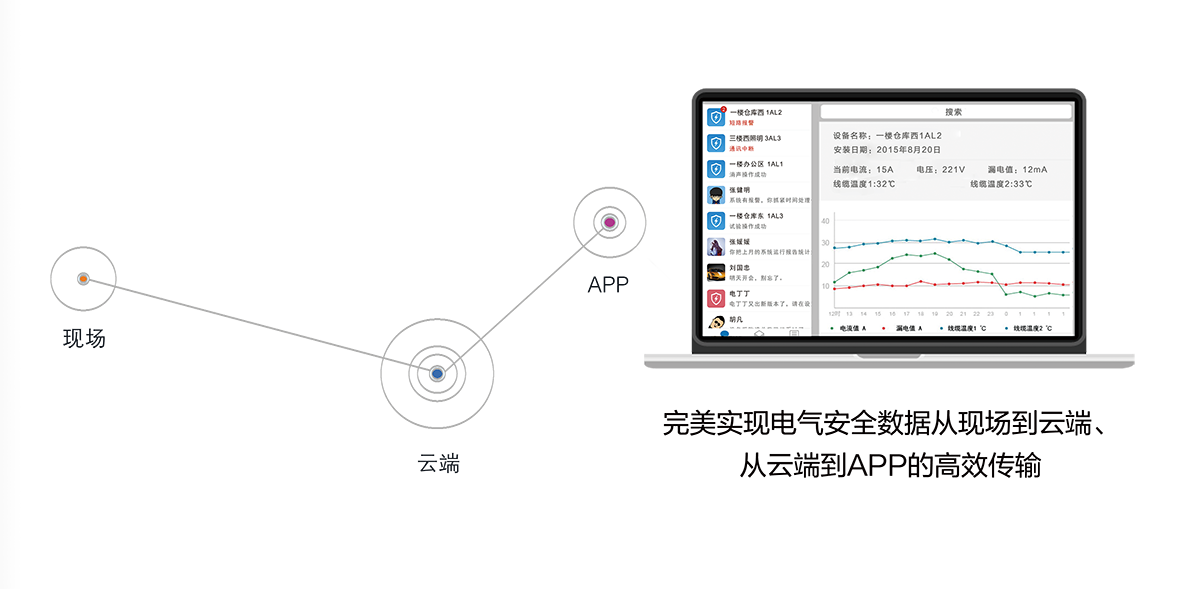 運(yùn)用云計(jì)算技術(shù),實(shí)現(xiàn)電氣安全數(shù)據(jù)從現(xiàn)場到云端,從云端到APP的高效傳輸,多維度智能檢測、分析漏電、電弧、過載、短路、線纜溫度異常等多項(xiàng)電氣安全危害,精確定位電氣火災(zāi)隱患地址,安全報(bào)警信息推送,讓電氣安全看得見、摸得著、防得了、控得住。