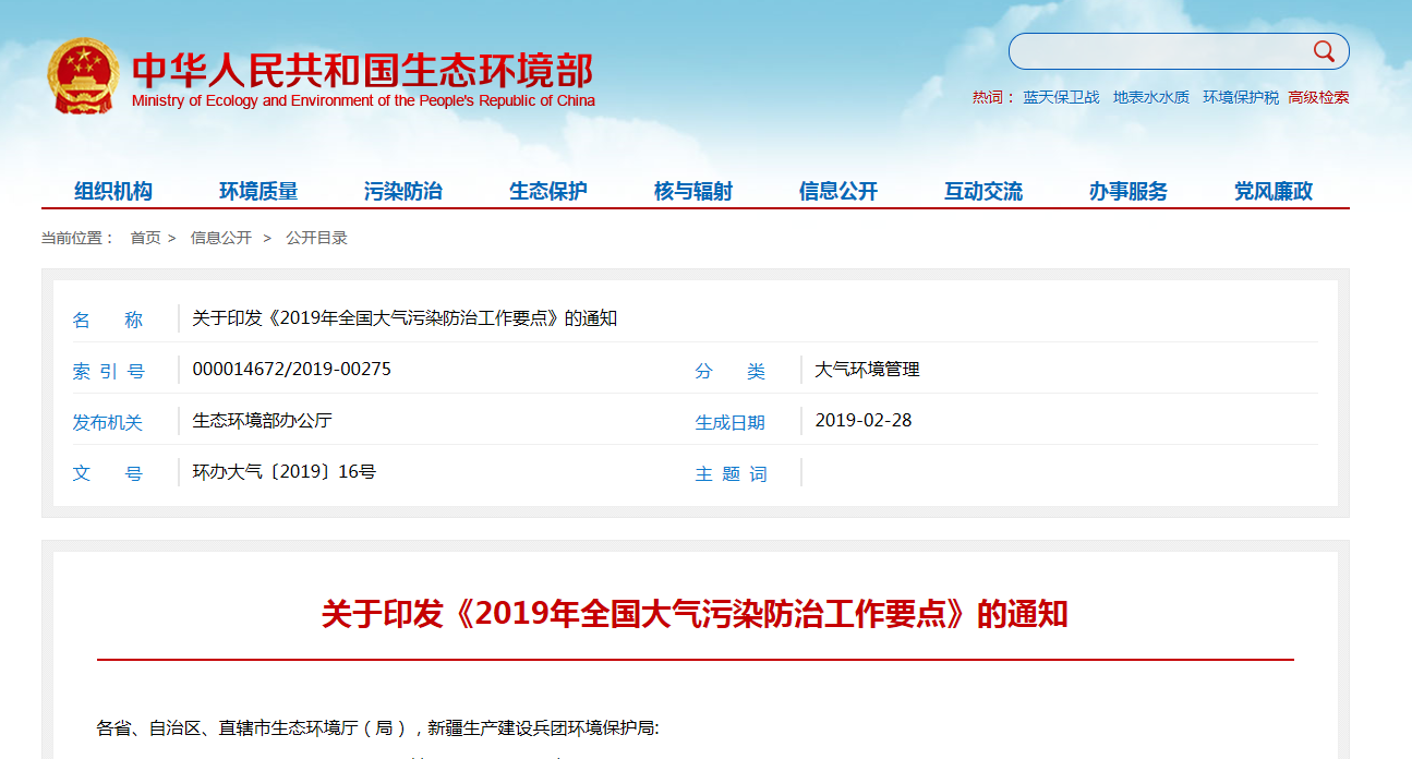 2019年02月28日,國(guó)家生態(tài)環(huán)境部辦公廳印發(fā)了關(guān)于《2019 年全國(guó)大氣污染防治工作要點(diǎn)》的通知,要求各省、自治區(qū)、直轄市生態(tài)環(huán)境廳要深入貫徹全國(guó)生態(tài)環(huán)境保護(hù)大會(huì)精神,全面落實(shí)《打贏藍(lán)天保衛(wèi)戰(zhàn)三年行動(dòng)計(jì)劃》的有關(guān)要求,深入開展大氣環(huán)境綜合管理,實(shí)現(xiàn)年度大氣環(huán)境保護(hù)的目標(biāo)。