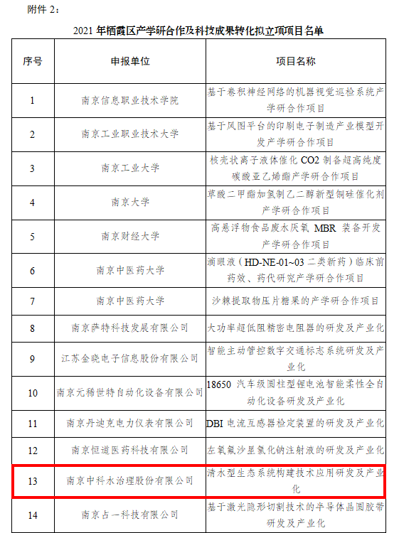 近日,我司科研項目《清水型生態(tài)系統(tǒng)構(gòu)建技術(shù)應(yīng)用研發(fā)及產(chǎn)業(yè)化》成功申報2021年棲霞區(qū)科技成果轉(zhuǎn)化項目。這是公司在科研方面的持續(xù)投入及創(chuàng)新能力的不斷提升,也是對公司研發(fā)實力的肯定。