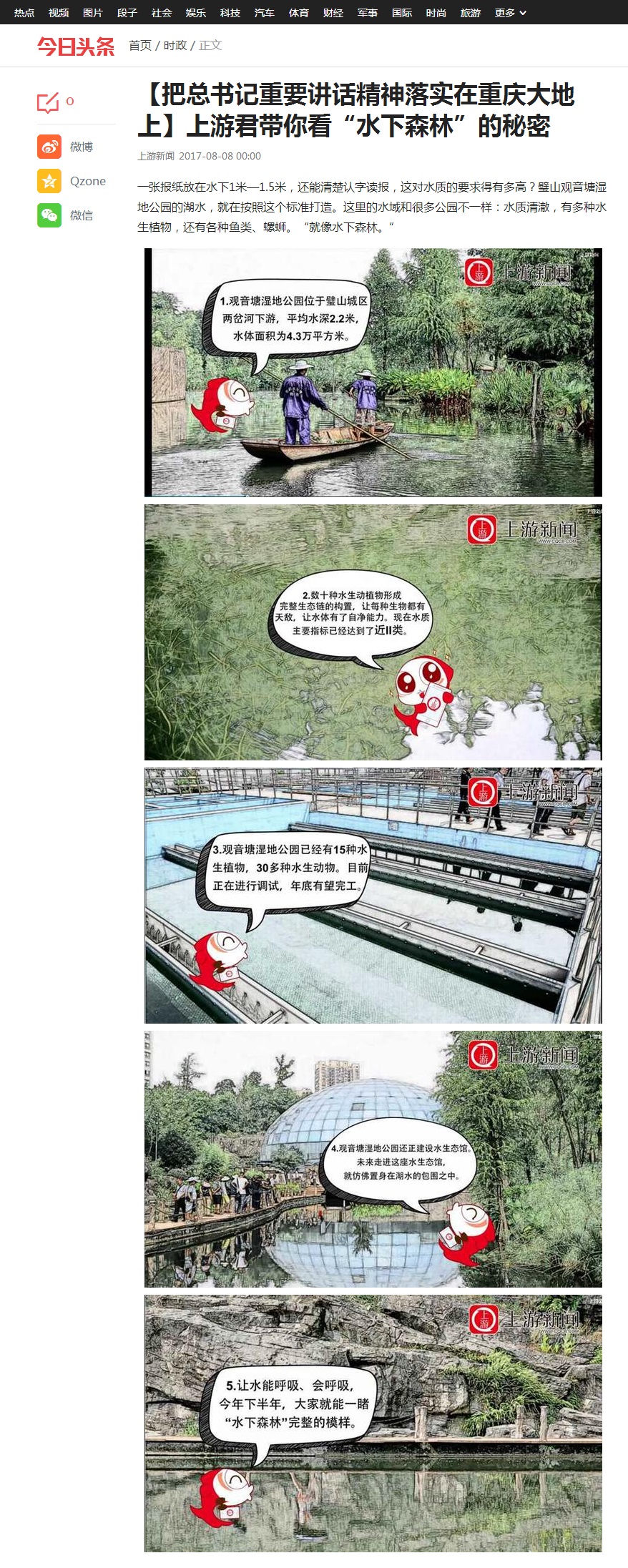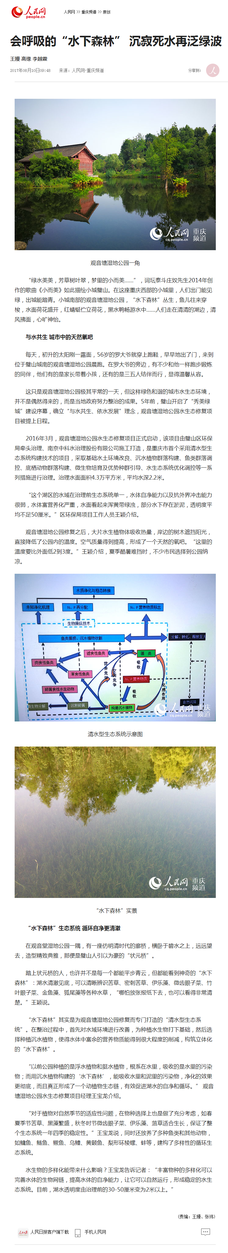 重慶日?qǐng)?bào)、重慶之聲、重慶電視臺(tái)、重慶晚報(bào)、重慶晨報(bào)、重慶商報(bào)、華龍網(wǎng)、《當(dāng)代黨員》雜志社等市級(jí)主流媒體記者,來(lái)到觀音塘濕地公園,實(shí)地探訪了“水下森林”建設(shè)情況,采訪了項(xiàng)目設(shè)計(jì)施工單位【南京中科水治理股份有限公司】工作人員。觀音塘濕地公園項(xiàng)目是由中科水治理傾力打造的精品水生態(tài)修復(fù)項(xiàng)目,也是重慶市首個(gè)生態(tài)文明建設(shè)示范基地。